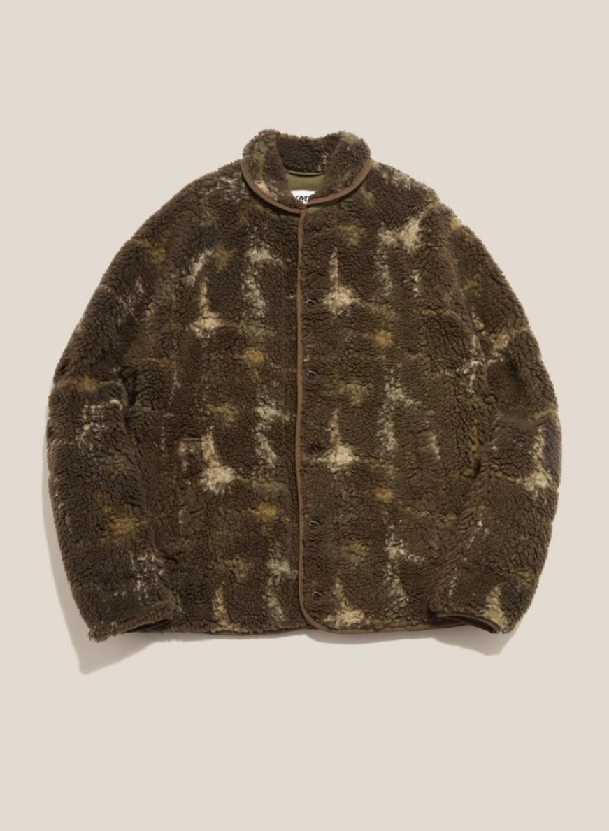 A heavyweight fleece jacket with YMC’s signature shawl style collar. Comes in a distinctive print inspired by disruptive pattern material.