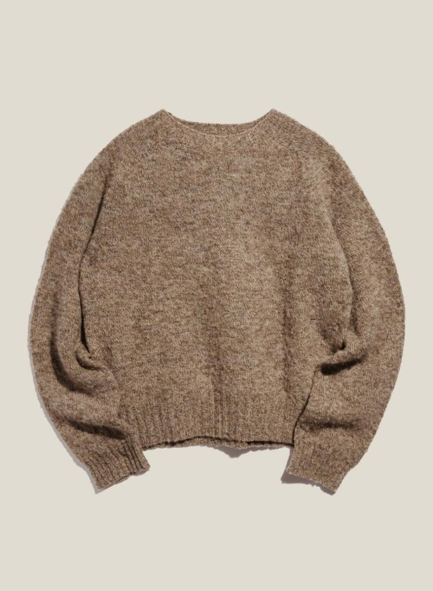 Oversized crew neck knit in brushed lambswool, made in Scotland at a zero-waste, plastic-free mill using green source energy. Relaxed fit with raglan sleeves.