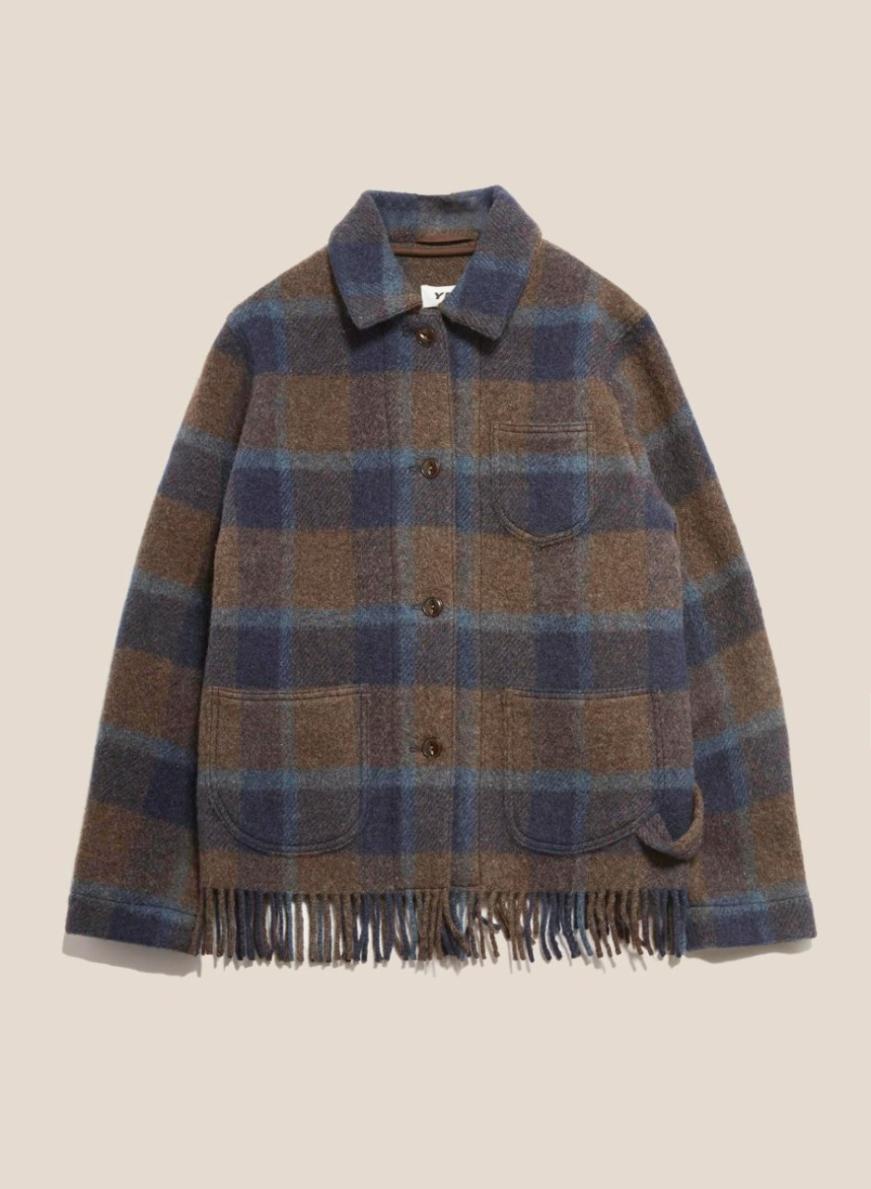 Workwear-inspired chore jacket in an Italian wool blanket check. Finished with fringe detailing.