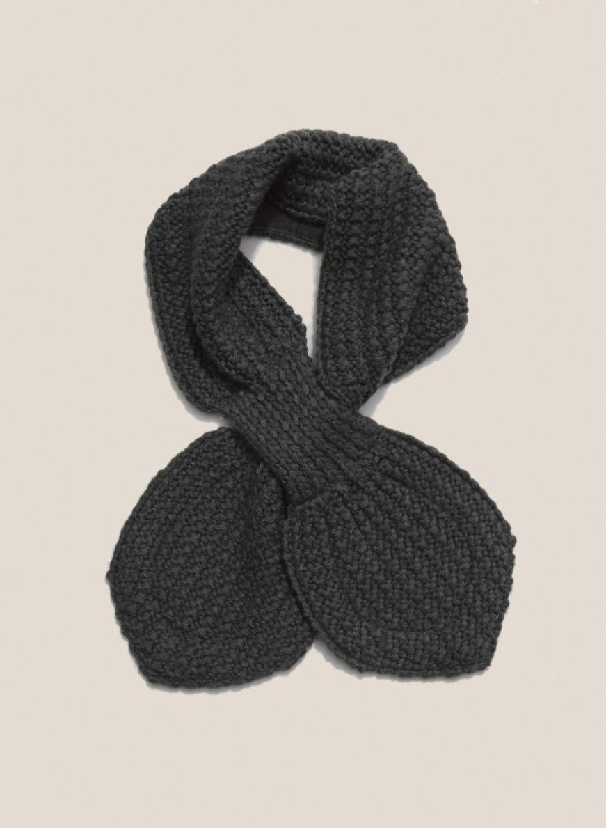 Knitted slot scarf made from wool blend yarn with ribbed detail, featuring a cut out slit to allow for fastening around the neck.