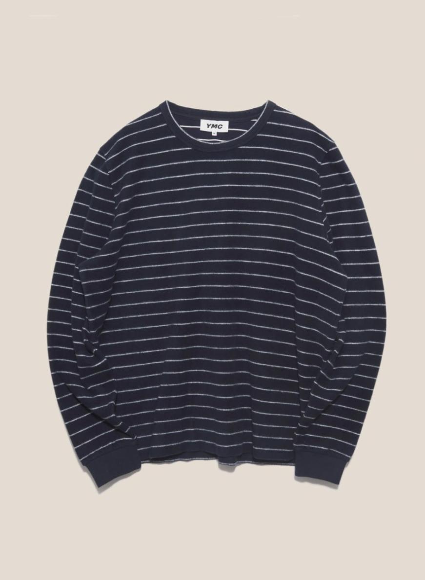 Striped, heavy cotton sweatshirt. Inspired by the slacker culture of the ’80s and ’90s.