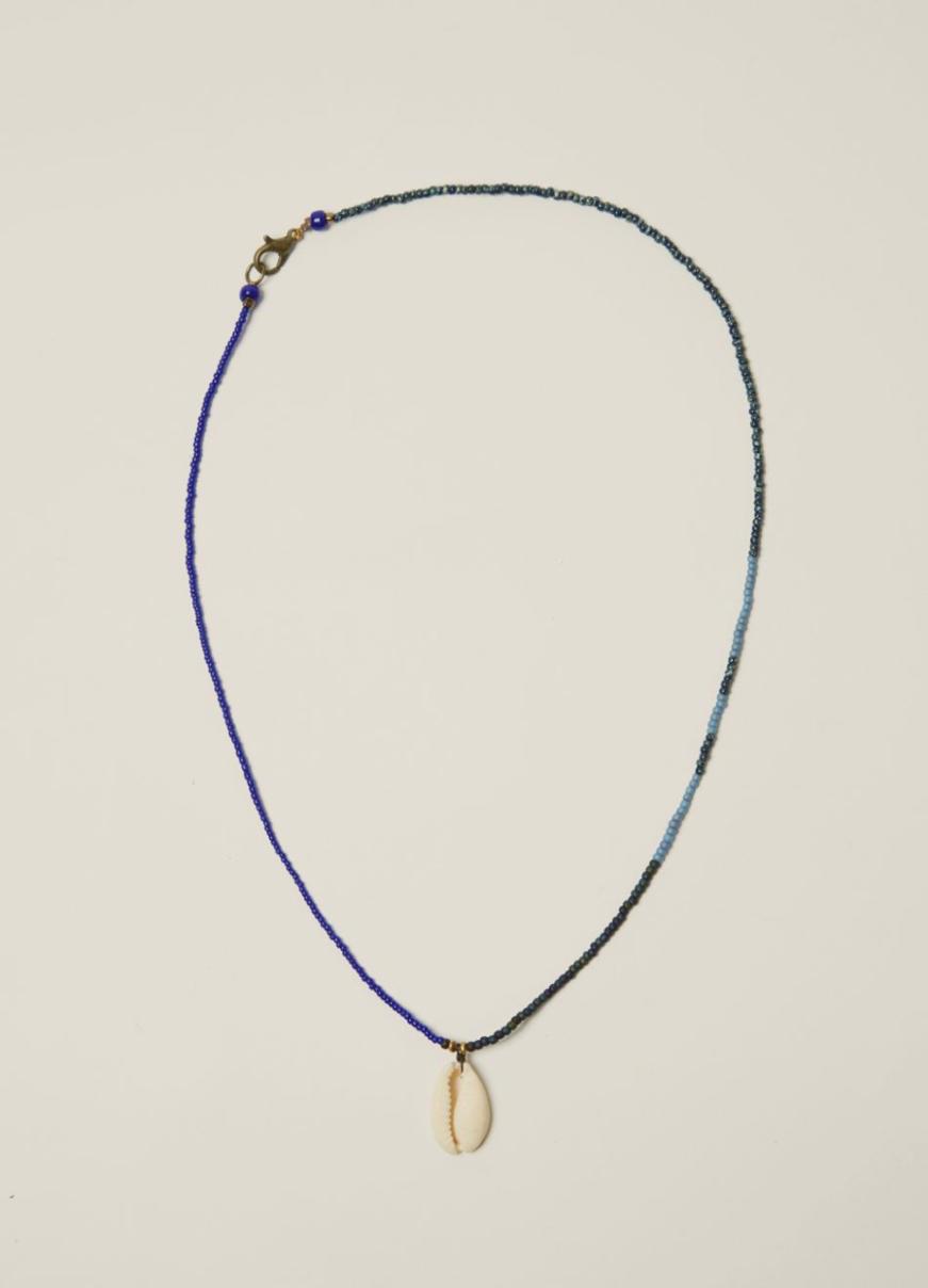 Beaded necklace with denim and blue Japanese miyuki seed and hammered brass beads, finished with full and half cowrie shell pendant.