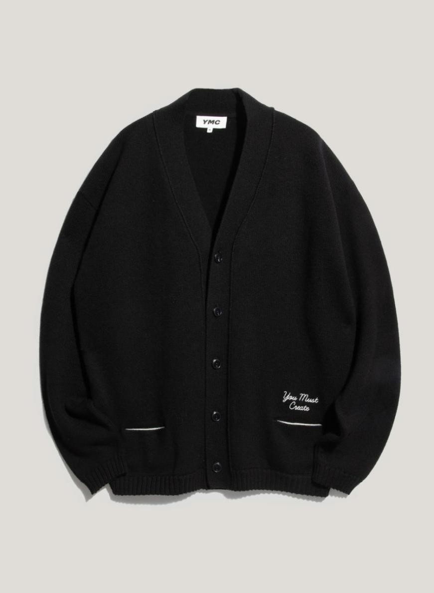 Luźny kardigan z grubej wełny merynosów, wykończony kontrastowymi kieszeniami wsuwanymi i haftem You Must Create.