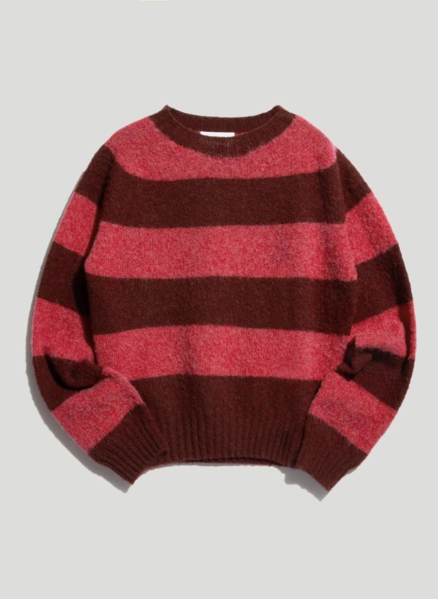 Luźny, dopasowany sweter z okrągłego dekoltu z szczotkowanej wełny jagnięcej i bezszwową konstrukcją. Wykończony tonalnymi, dwoma paskami.