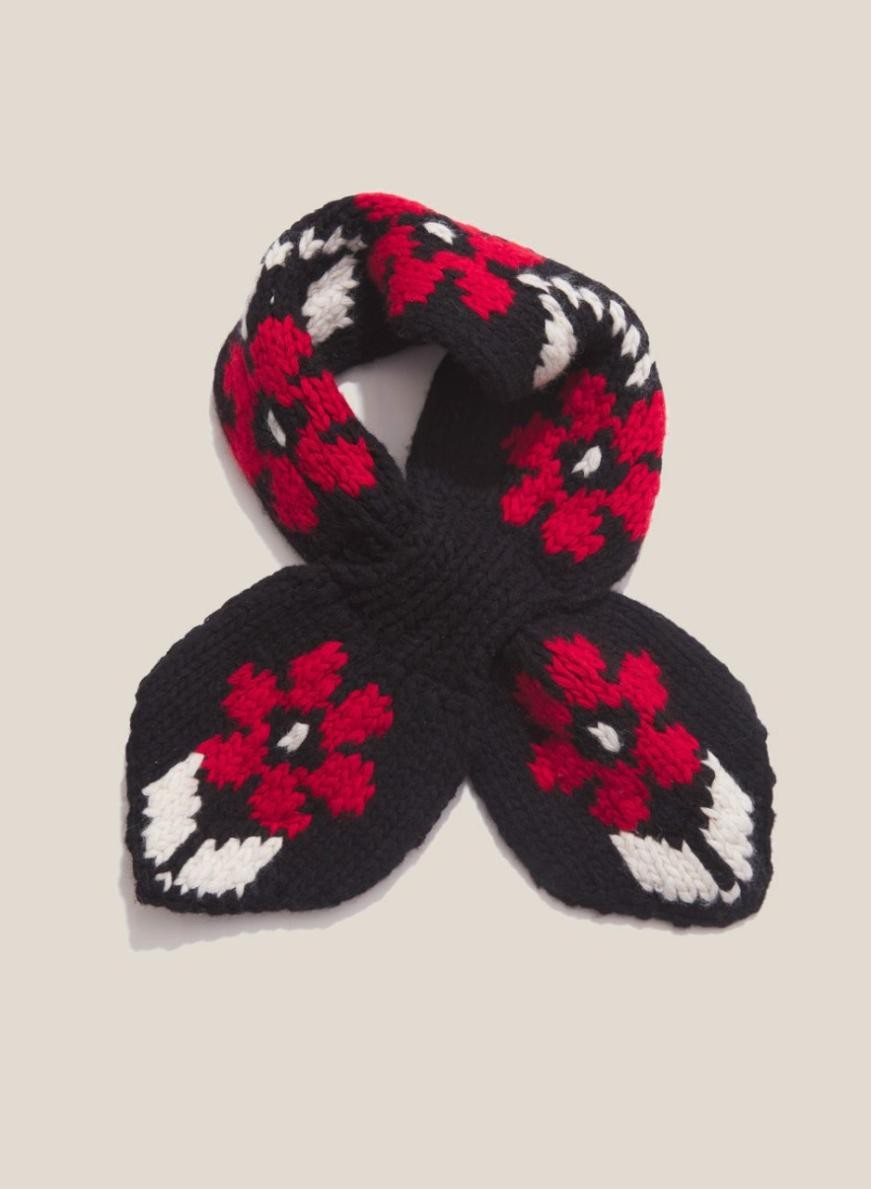 Dzianinowy szalik z rozcięciem, wykonany z przędzy z mieszanki wełny z intarsjowanym wzorem kwiatowym, z wycięciem umożliwiającym zapięcie wokół szyi.