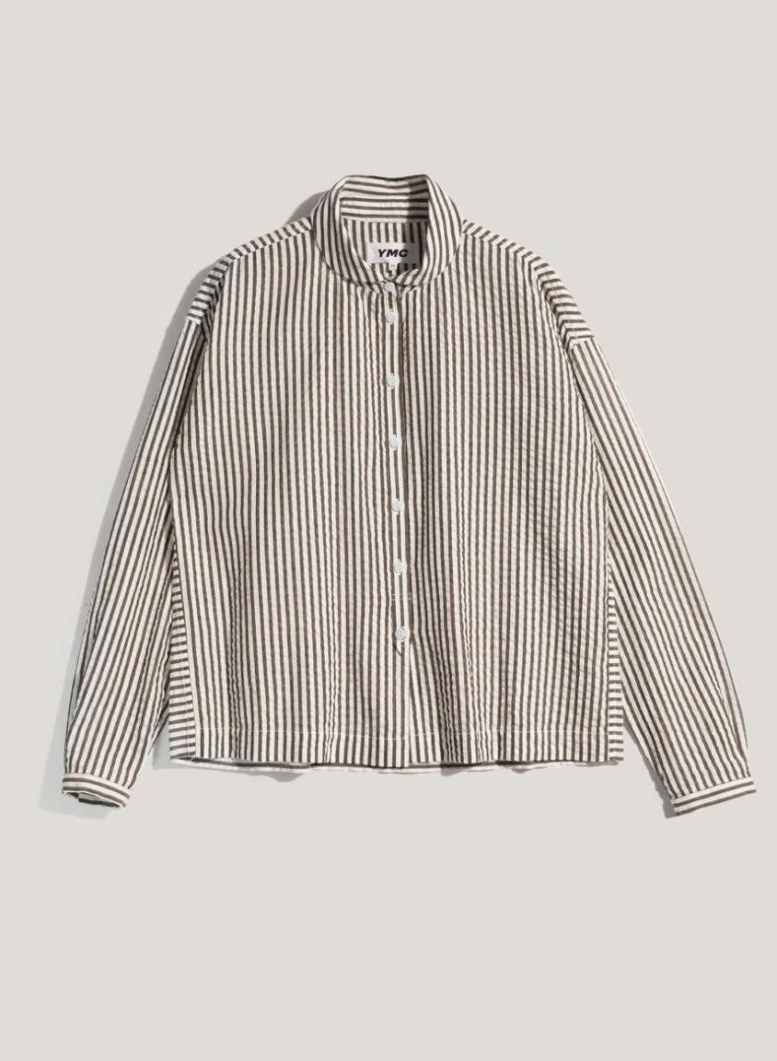 Cămașă lejeră cu mânecă lungă, confecționată din material seersucker din bumbac cu dungi și texturat. Finisată cu guler decupat și o singură pliuire la spate.