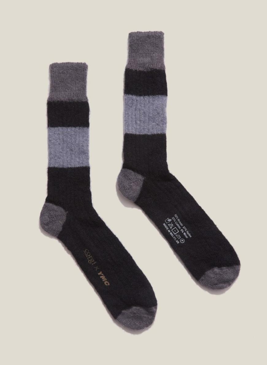 Mohair sport socks with contrast toe, heel and cuff and contrasting colour stripes.